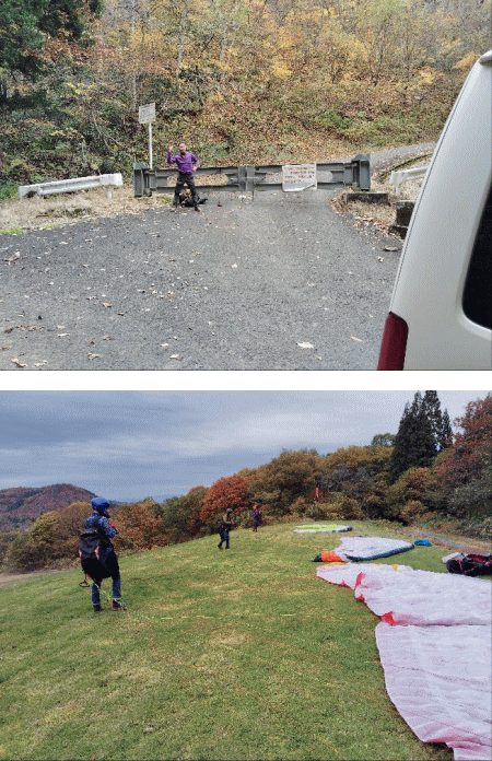 東の風が強いのでフライトなし、タンデムフライトのお客さまと次回の下見をして頂きました。